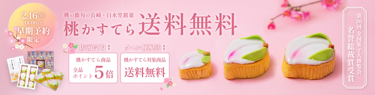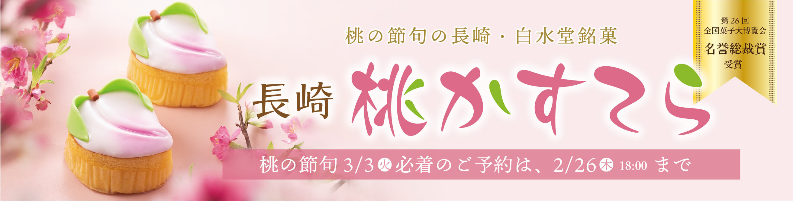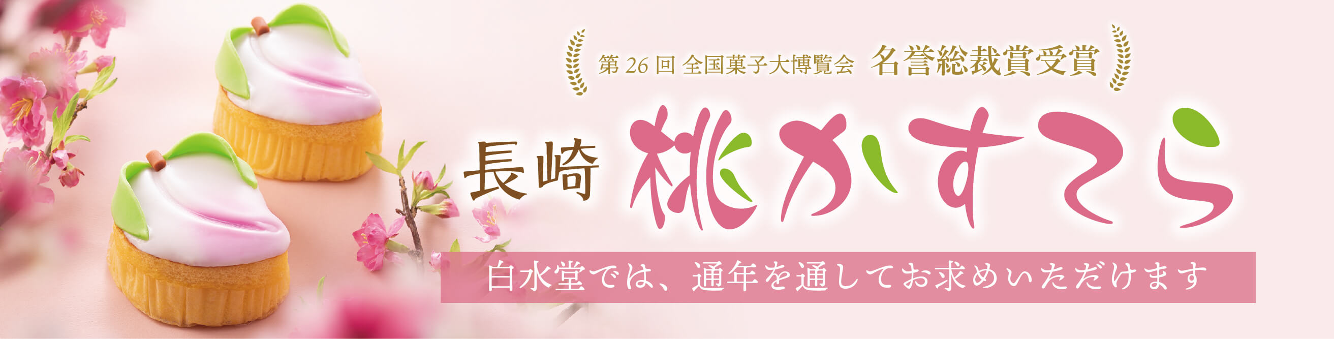 商品 れもも 季節菓子 桃かすてら かすてら びわゼリー 引き菓子 新着情報 2026.01.21 桃かすてらのご予約と早割キ... 白水堂では桃の節句をお祝いする長崎らしいお菓子として、桃かす... 2025.11.10 白水堂クリスマスケーキ・迎... 平素より白水堂をご愛顧いただきまして、 誠にありがとうござい... 2025.10.08 雑誌「ESSE」11月号別... 平素より白水堂をご愛顧いただきまして、 誠にありがとうござい... もっと見る» 季節の調べ 季節の移ろいを繊細に伝える、職人が一つひとつ手作りにこだわる季節の和菓子。 季節の調べ 商品一覧 白水堂のこだわり 先代から受け継がれる想いを紡ぎ、熟練の技術と経験を大切に、時代に寄り添う。 もっと見る» 店舗について 長崎の繁華街・思案橋電停のそばに本店を構え、その他3店舗の支店を展開。 もっと見る» 和風喫茶志らみず 創業当時から変わらない味わいが世代を超えて親しまれている和の甘味・食事処。 もっと見る» 白水堂公式SNS 公式Instagramでキャンペーンや商品情報を配信中。 もっと見る»